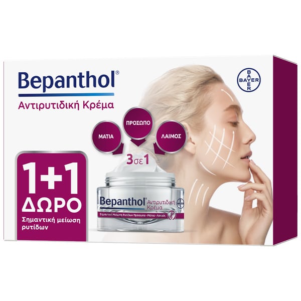 Η Bepanthol® Αντιρυτιδική Κρέμα για Πρόσωπο, Μάτια & Λαιμό μειώνει σημαντικά τις ρυτίδες -βελτιώνει τη σφριγηλότητα – θρέφει, προσφέρει λάμψη και ενυδάτωση. Χάρη στο συνδυασμό του εκχυλίσματος λιπιδίων Juvenessence®, πεπτιδίων, βιταμινών Α & Β5 και λιπαρών οξέων που περιέχει θα έχετε ορατά αποτελέσματα μείωσης των ρυτίδων σε μόλις 28 ημέρες!