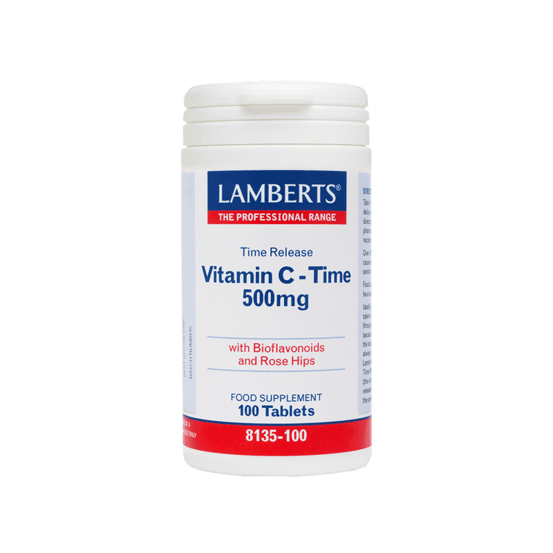To σκεύασμα Vitamin C Time Release 500mg της Lamberts παρέχει εγγυημένα 500mg Βιταμίνης C σε δισκία ελεγχόμενης αποδέσμευσης και μία σημαντική ποσότητα βιοφλαβονοειδών (ρουτίνη, κερσετίνη, κιτρίνη και εσπεριδίνη) τα οποία συμβάλλουν στην απορρόφησή της από τον οργανισμό και σκόνη καρπών αγριοτριανταφυλλιάς (Rose Hips). Όπως όλα τα σκευάσματα της Lamberts, παρασκευάζεται εντός του Ηνωμένου Βασιλείου σύμφωνα με τα αυστηρά πρότυπα της Φαρμακευτικής GMP (Pharmaceutical GMP).