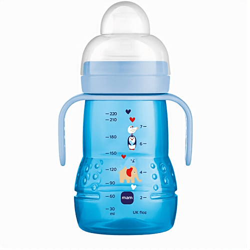 Μπιμπερό μετάβασης σε ποτηράκι. Το MAM Trainer+ είναι το ιδανικό μπιμπερό για το μωρό που αρχίζει να πίνει μόνο του. Δεν στάζει και είναι εύκολο στο κράτημα.